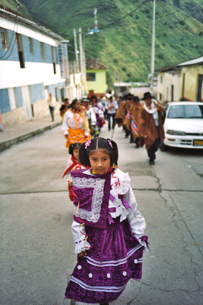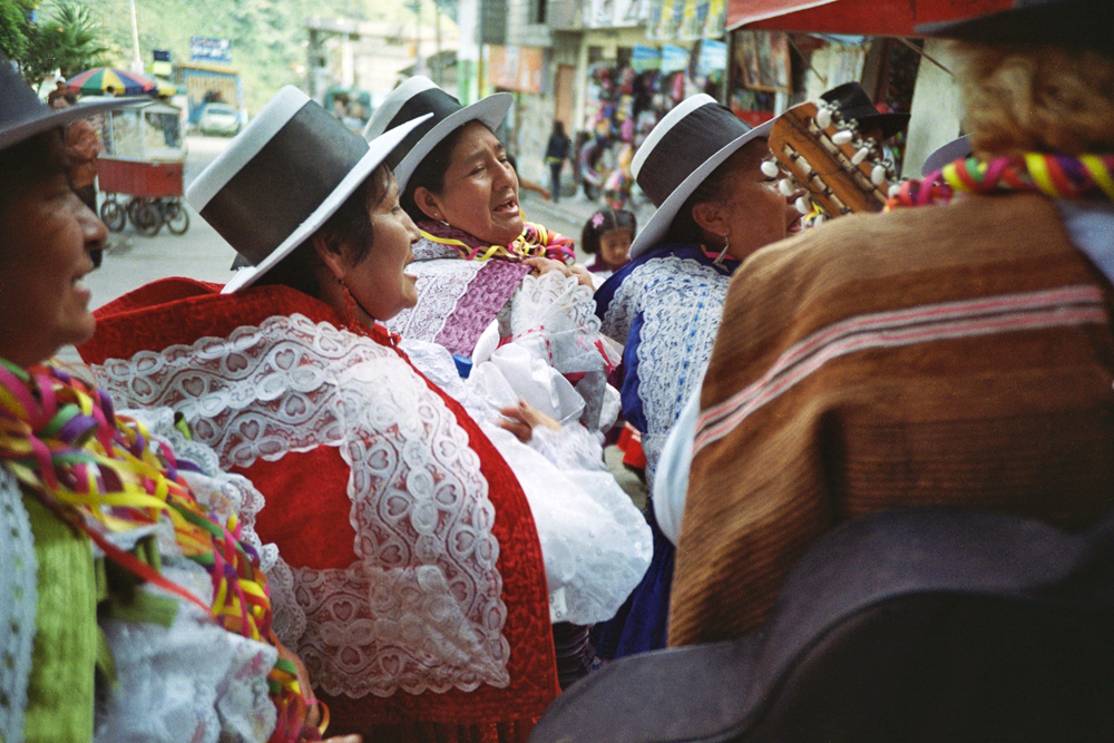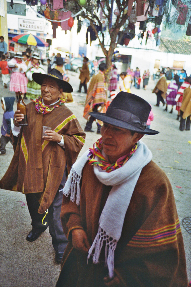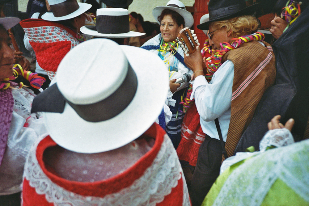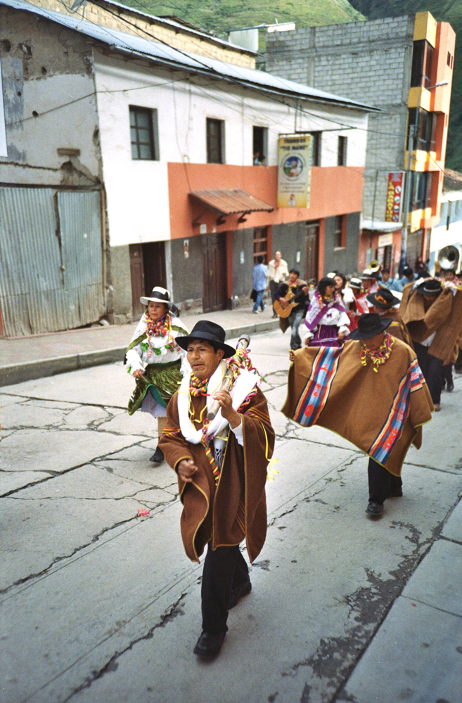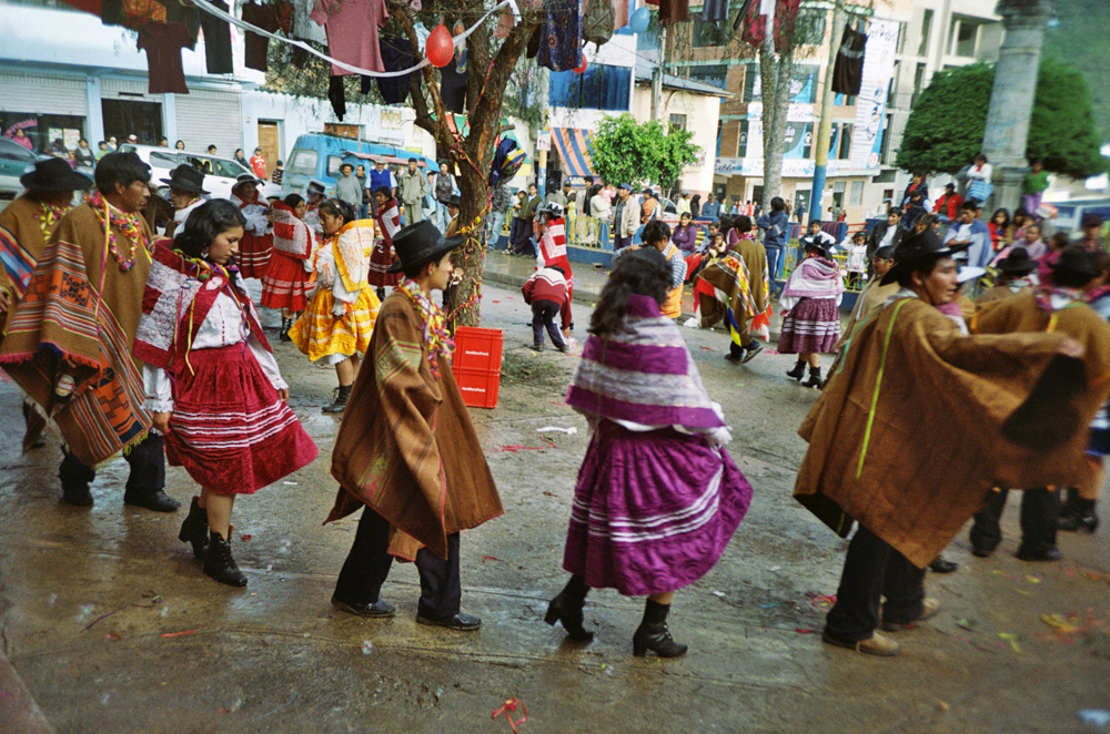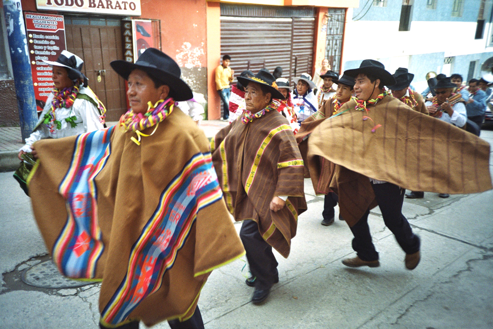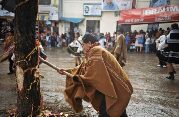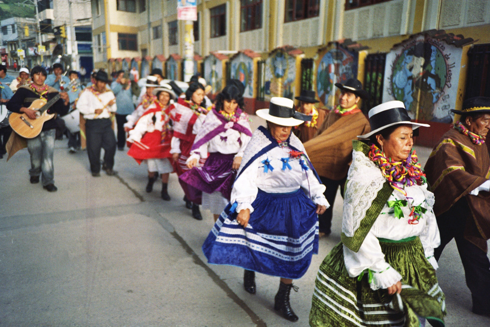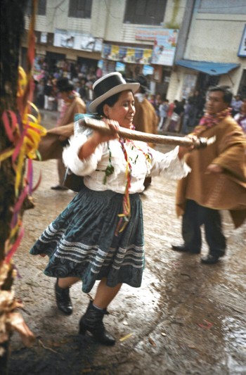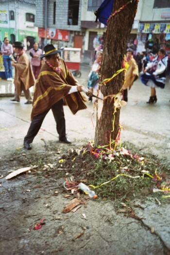 Dig a hole in the ground in the middle of a small town, put a big tree inside full of gifts like a christmas tree, dance around the tree and drink a lot of beer, with an axe chop the tree until it falls and run over to it to get your gift... Here is the peruvian carnival with the local brass band !